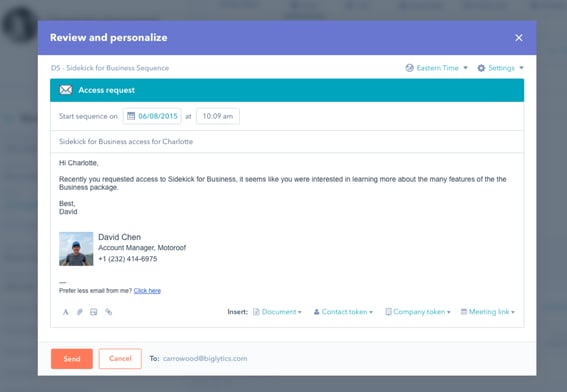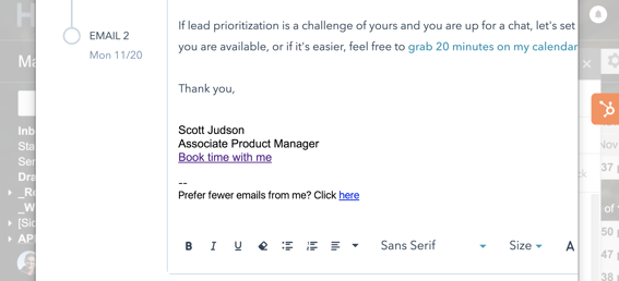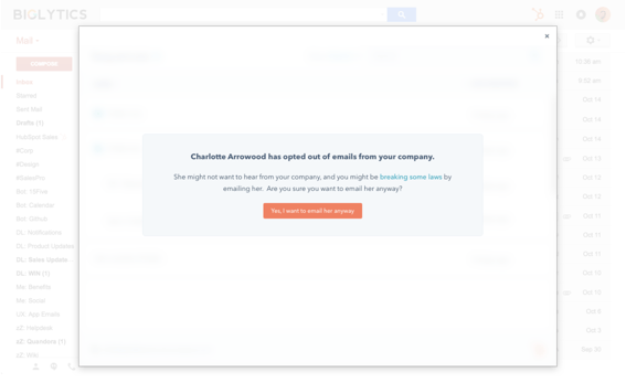 Maintain compliance with local spam laws.Countries across the globe have rolled out laws requiring that commercial emails, whether one-to-one or one-to-many, include an unsubscribe link that lets your recipient tell you, “no thanks”. Unsubscribe links are a great step towards legal compliance and the perfect way to make sure your sales playbook is built with the buyer in mind. |